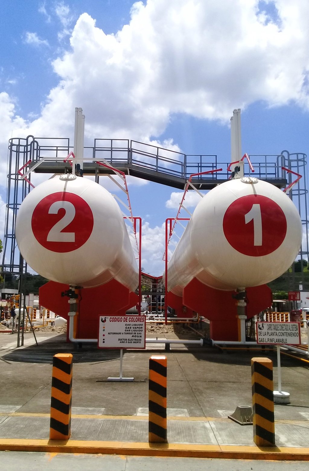 · Se exige cuando menos, un extintor tipo carretilla de 50 kg de polvo químico seco, más múltiples portátiles de al menos 9 kg, distribuidos por zonas críticas como áreas de recepción, muelles de llenado, almacenamiento, compresores, generadores electicos, talleres y estacionamientos.